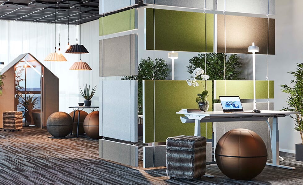 Vi har et stort utvalg av støydempende produkter som egner seg veldig godt på kontoret, møterommet og i kantina. Ecosund Effekt Hush er lyddempende plater med tekstiloverflate som benyttes som bl.a romdelere i åpne kontorlandskap. Ecosund Effect Hush er enkel å montere, samt elegant å se på. Den er derfor et veldig populært produkt som ofte blir brukt i åpne kontorlandskap. I kontorlandskap der det ikke er mulig med romdeler kan man f.eks benytte Dempit Master B, som er en lyddempende vegg- og takplate som enkelt monteres ved å lime platene kant til kant direkte i taket.