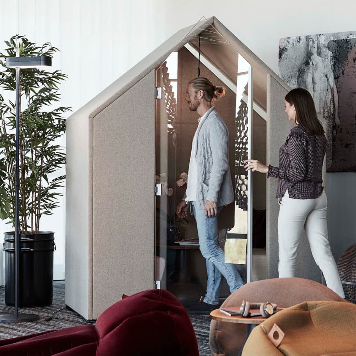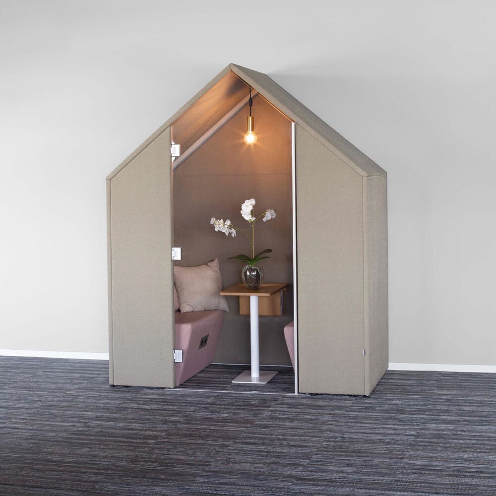 Det lydabsorberende huset kan brukes som en individuell arbeidsstasjon, et lite sitte-og-stå-møterom eller en