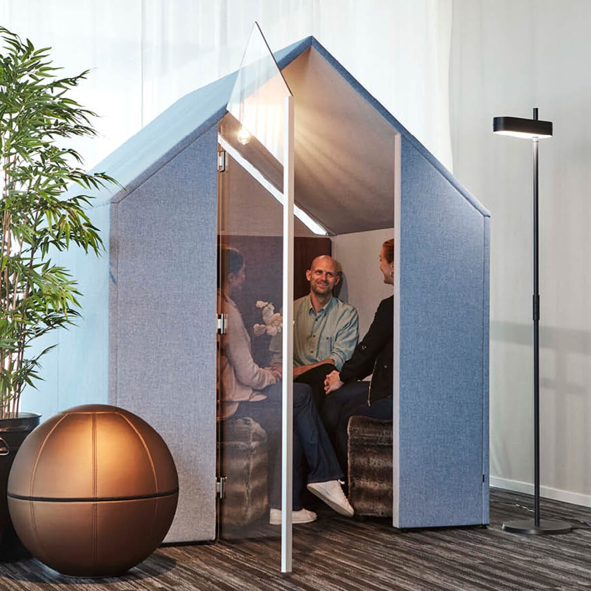 The Hut er et lydabsorberende hus som kan brukes som en individuell arbeidsstasjon, et lite sitte-og stå-møterom eller som en avslapningssone med The Hut Sofa. Husets enkle og rette linjer er inspirert av det klassiske Monopol-spillet og dets brikker, noe som gir en tidløs form for det populære og praktiske «rom i et rom»-konseptet.
