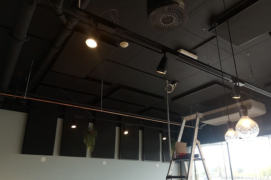 Reduksjon av støy og dårlig akustikk i frisørsalong Reduksjon av støy og dårlig akustikk i frisørsalong i Lørenskog. Denne frisørsalongen i Lørenskog var plaget av sjenerende støy grunnet dårlig akustikk i rommet. Her monterte vi Lydac Dempit i sort farge slik at den gikk i ett med taket. Montert både i tak og på vegg.