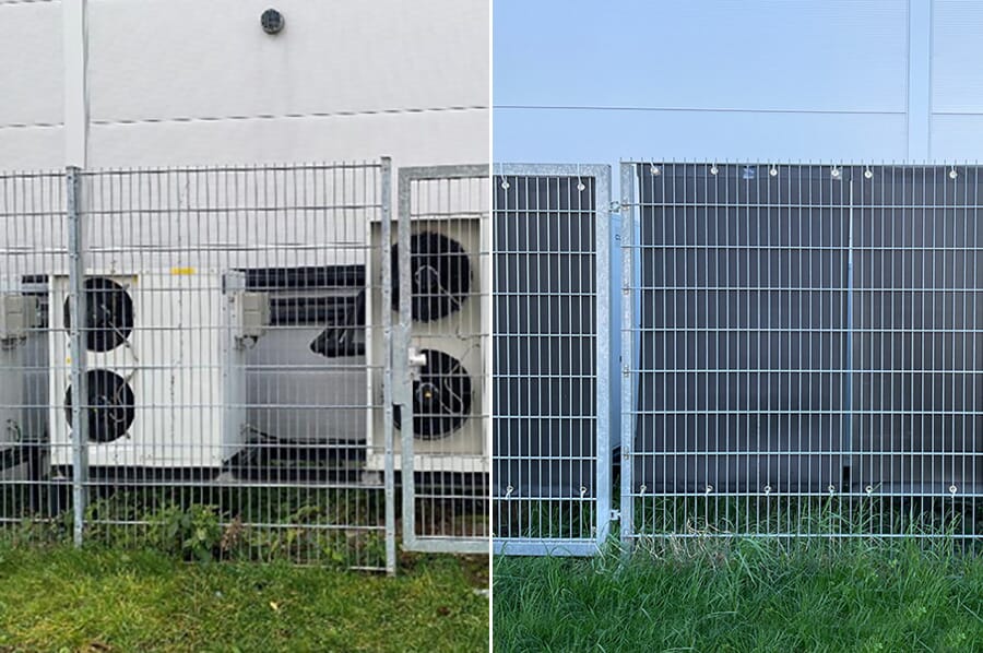 Kunden har airconditionanlegg på utsiden av bygg som lagde sjenerende støy for omgivelsene rundt. Kunden sendte oss mål av gjerdet de hadde rundt tomten og vi tilpasset og hang på Acoustifence på gjerdet. Acoustifence er et støydempende materiale som absorberer støy veldig godt.