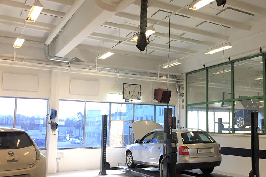 Støydemping av bilverksted Støydemping av bilverkstedet ProMeister. Bilverkstedet var plaget av sjenerende støy i verkstedhallen. Her er det montert Dempit Industri, lydabsorberende plate, i tak og på vegg, som har redusert den sjenerende støyen.