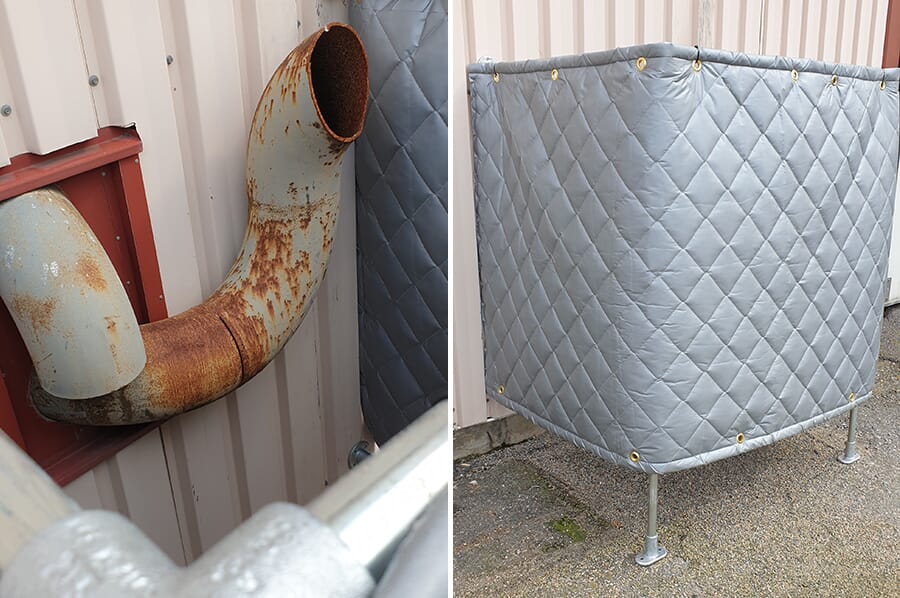 Støydemping av ventilasjonsutgang Støydemping av ventilasjonsutgang på bygg. Støydemping av varmepumpe ved bruk av kiltduken Kinetics. Kiltduken Kinetics er her montert rundt det monterte stativet. Demper støyen fra ventilasjonsuttaket.